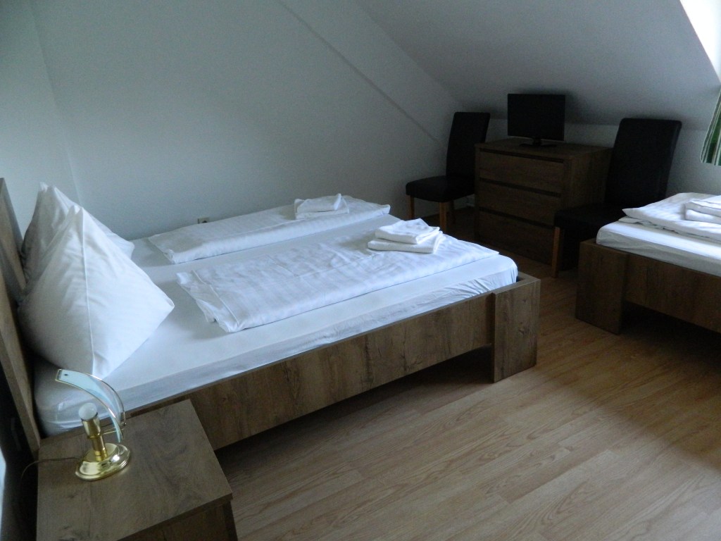 Unsere Dreibettzimmer verfügen über 1 Ehebett ( 180 cm x 200 cm ) und 1 Singlebett ( 90 x 200 cm ), Fernseher, Telefon, Badezimmer mit Dusche oder Bad.